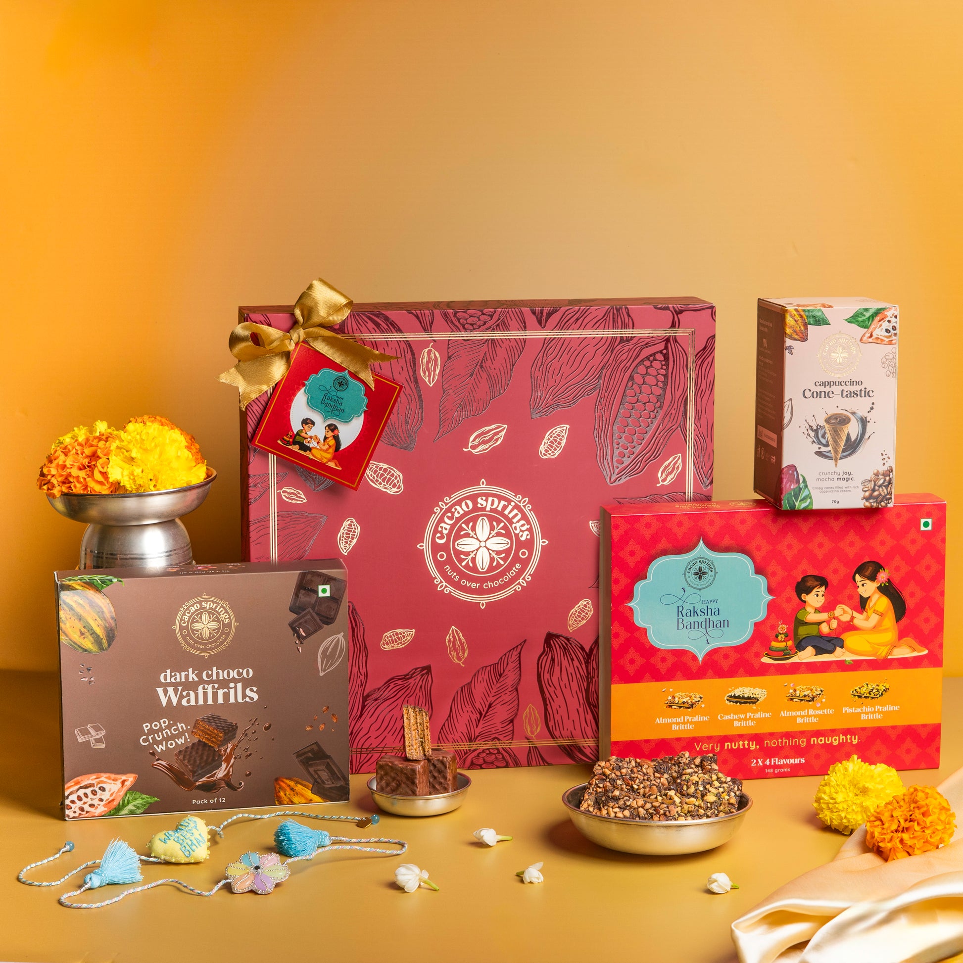 Celebrate the festival of lights with the Rakhi Red Rigid Gift Box, a luxurious collection of premium treats from Cacao Springs. Perfect for sharing the joy of the season, this box is filled with a delightful assortment of our finest sweets, each crafted with love and care to bring festive cheer to your loved ones.