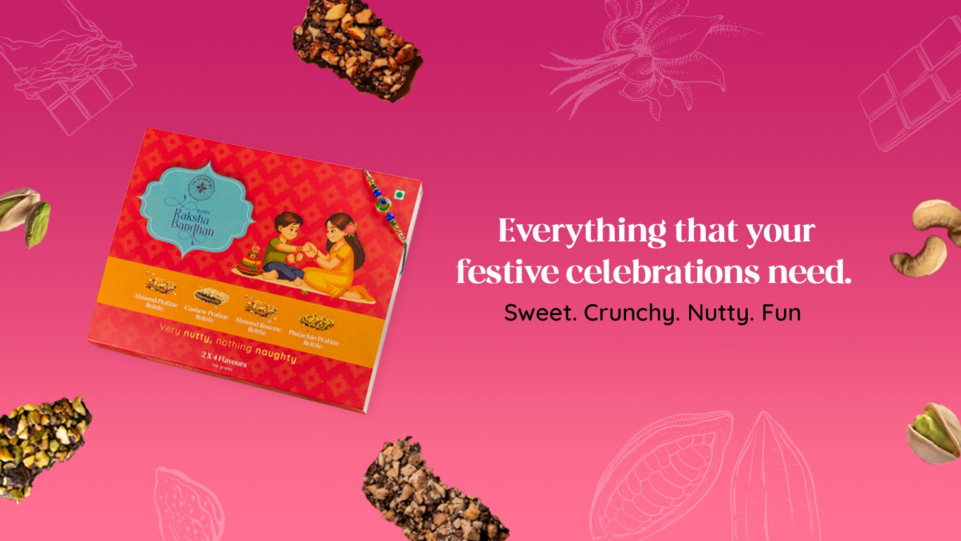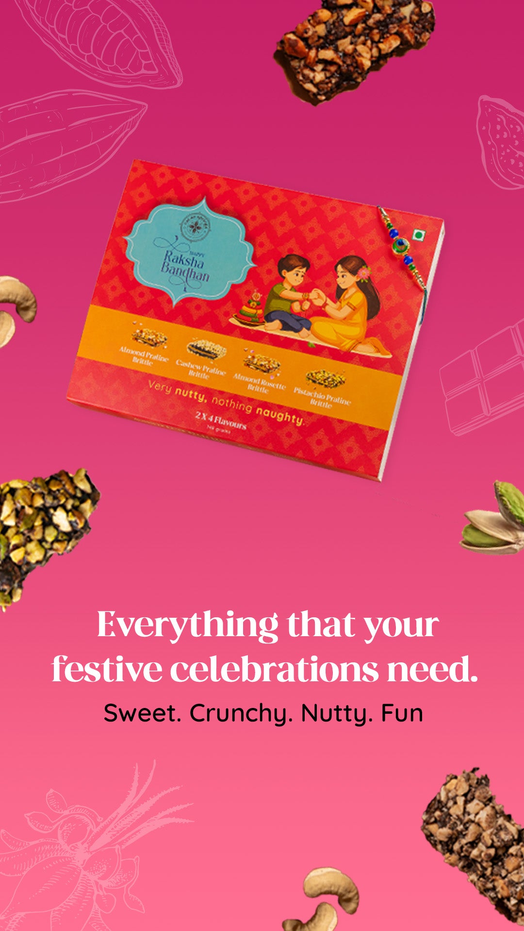 Perfect for Rakhi, this hamper celebrates the bond of love and security between siblings. It includes an assortment of Almond Praline Brittle, Almond Rosette Brittle, Pistachio Praline Brittle and Cashew Praline Brittle, promising richness in every bite.