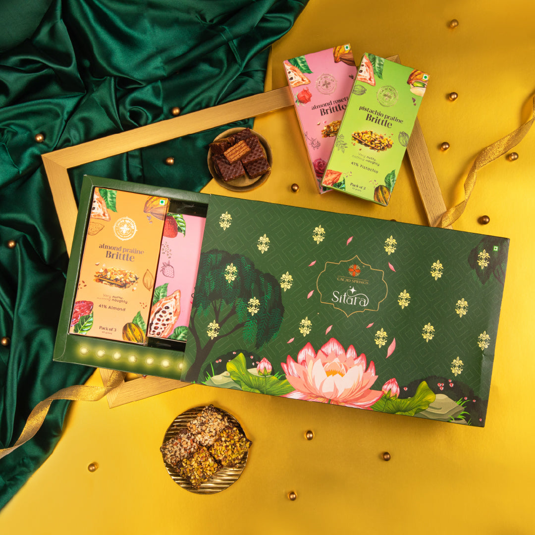 The Sitara Gift Box is a luxurious treat designed to dazzle and delight. This elegant collection combines the best of Cacao Springs' signature brittles and crisp wafers, making it the perfect gift for any special occasion or celebration.